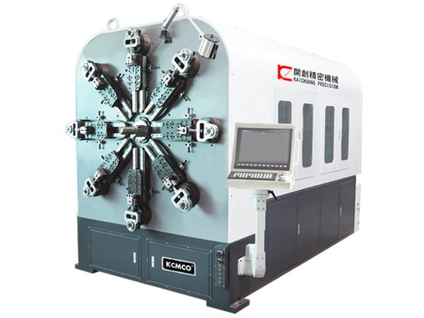 開創(chuàng)KCT-1260WZ十二軸無凸輪數(shù)控萬能彈簧轉(zhuǎn)線成形機(jī)利用臺(tái)灣Windows7操作控制系統(tǒng)、引用日本進(jìn)口安川伺服電機(jī),采用獨(dú)特的無凸輪和無搖臂設(shè)計(jì),刀架由八組伺服馬達(dá)獨(dú)立控制,其中刀架八軸、送線一軸、轉(zhuǎn)芯一軸、轉(zhuǎn)線一軸和卷曲一軸,其統(tǒng)成由曲柄連桿成形系統(tǒng)、送線系統(tǒng)、轉(zhuǎn)線系統(tǒng)、校直系統(tǒng)和轉(zhuǎn)芯系統(tǒng)等組成。此外,該機(jī)型可配帶液壓剪刀裝置,切割噪音小,對(duì)芯棒及機(jī)器的損害為零;同時(shí)也極大的提升了彈簧加工范圍,不僅具有成形快、精度準(zhǔn)和性能穩(wěn)等特點(diǎn),而且調(diào)機(jī)更方便,易操作。